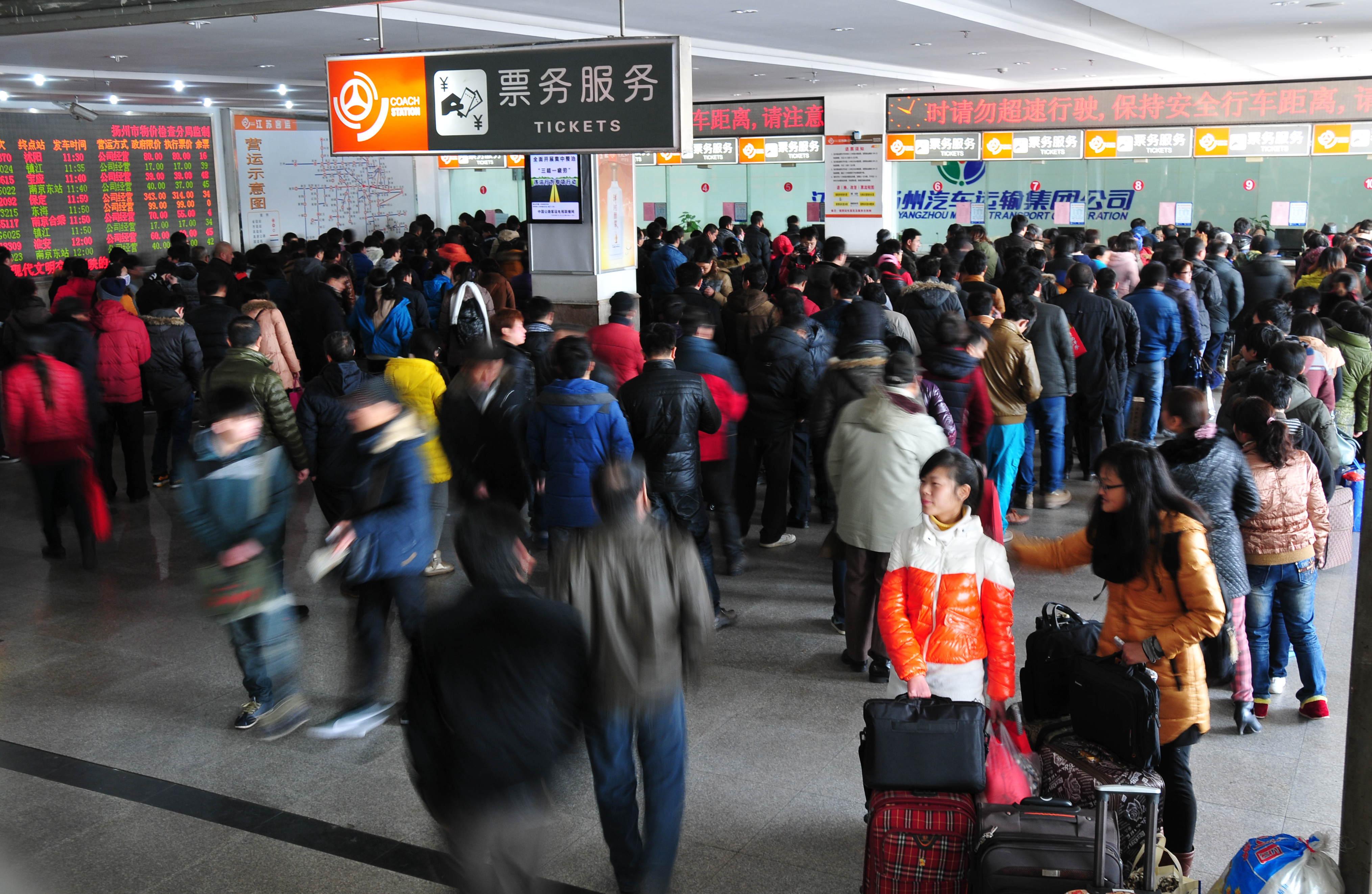 為應(yīng)對旅客購票高峰壓力,揚(yáng)州汽車站打開了10個售票窗口,汽車東站打開了7個售票窗口,另外還使用了自助售票機(jī)、配備了退票專窗、手機(jī)換取票專窗。為方便民工返鄉(xiāng),車站還主動聯(lián)系揚(yáng)州晚報推出“民工返鄉(xiāng)直通車”,集中為市區(qū)周邊廠礦工地的民工兄弟團(tuán)體預(yù)訂了近萬張汽車票。