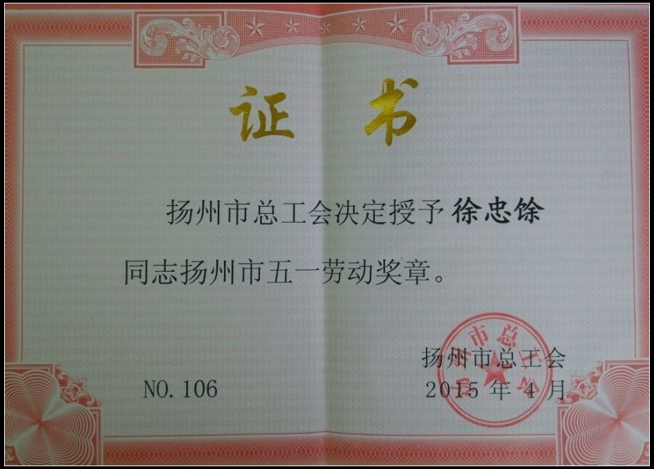 我司職工徐忠馀榮獲揚(yáng)州市五一勞動獎?wù)?/div>
