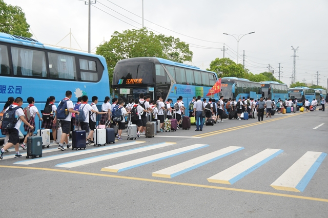 江蘇揚汽集團承擔了此次新生運輸任務(wù),由旅游出租分公司牽頭,抽調(diào)快客、快鹿等各有車單位的大客車38輛,運送樹人中學師生近2000人。