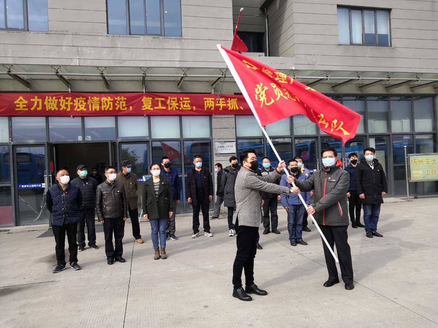 2月24日,揚汽班線復(fù)運首日,揚汽集團修理廠黨支部黨員先鋒突擊隊成立大會在修理廠召開。二十多名黨員組成的先鋒突擊隊,分成疫情防控、復(fù)工保運、志愿服務(wù)三個小組,一把手廠長親自擔(dān)任隊長,書記、干部、勞模分別擔(dān)任組長,并將工作任務(wù)分解成九個大項,明確責(zé)任人,統(tǒng)籌安排好恢復(fù)生產(chǎn)的各項工作。在困難面前,充分體現(xiàn)出了共產(chǎn)黨員的責(zé)任與擔(dān)當(dāng)。集團黨委副書記顧懷代表集團黨委為修理廠黨員先鋒突擊隊授旗,鼓勵他們在關(guān)鍵時刻能夠挺身而出,發(fā)揮黨員自身的先鋒模范作用,為揚汽集團在疫情期間的復(fù)工保運工作作出積極貢獻。