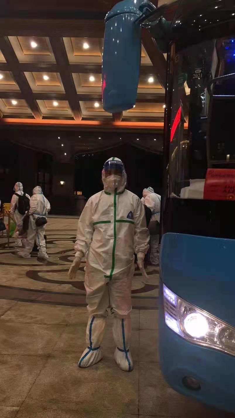 由于南京的疫情有所好轉(zhuǎn),家鄉(xiāng)揚州的疫情又突發(fā),7月31日接到通知返回揚州繼續(xù)“作戰(zhàn)”;氐綋P州后到疾控中心做完核酸檢測一切正常,并前往酒店進行隔離,準備全身心投入后續(xù)轉(zhuǎn)運工作。每當執(zhí)行轉(zhuǎn)運任務(wù)時,穿著防護服、戴著護目鏡開車,對有豐富駕駛經(jīng)驗的他來說,仍是一個不小的挑戰(zhàn),全身被包裹得密不透氣,行動十分不方便,必須高度集中精神,小心駕駛確保行車安全。談及轉(zhuǎn)運工作,魏建也記不清轉(zhuǎn)運了多少趟隔離人員了,反正每趟任務(wù)都安全保質(zhì)保量的完成了。