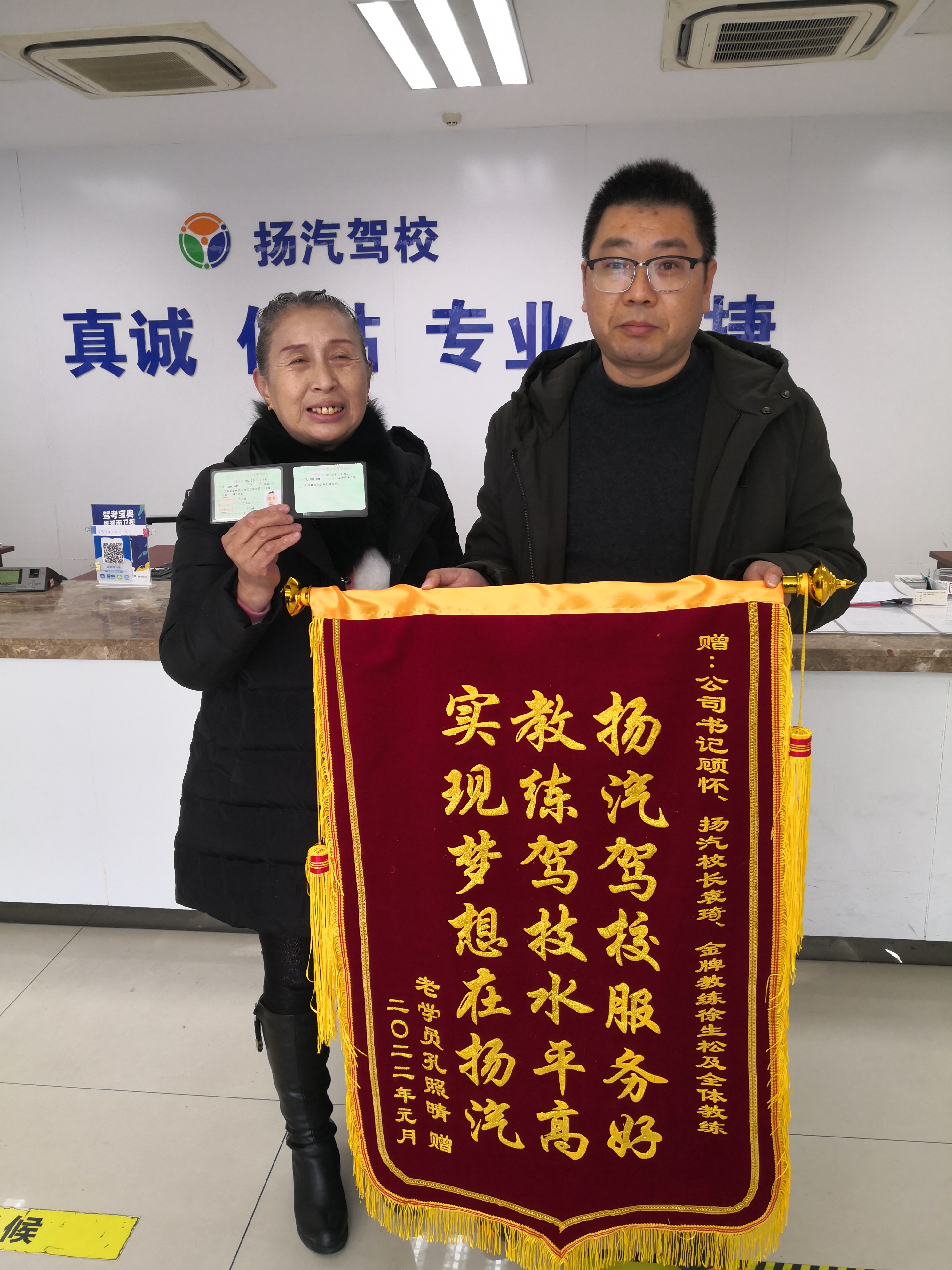 近日,67歲的孔大媽滿懷喜悅之情帶著新聞媒體的記者一同來到駕校,領(lǐng)取了她夢寐以求的駕駛證,同時為駕校送上了“揚汽駕校服務(wù)好 教練駕技水平高 實現(xiàn)夢想在揚汽”的錦旗。