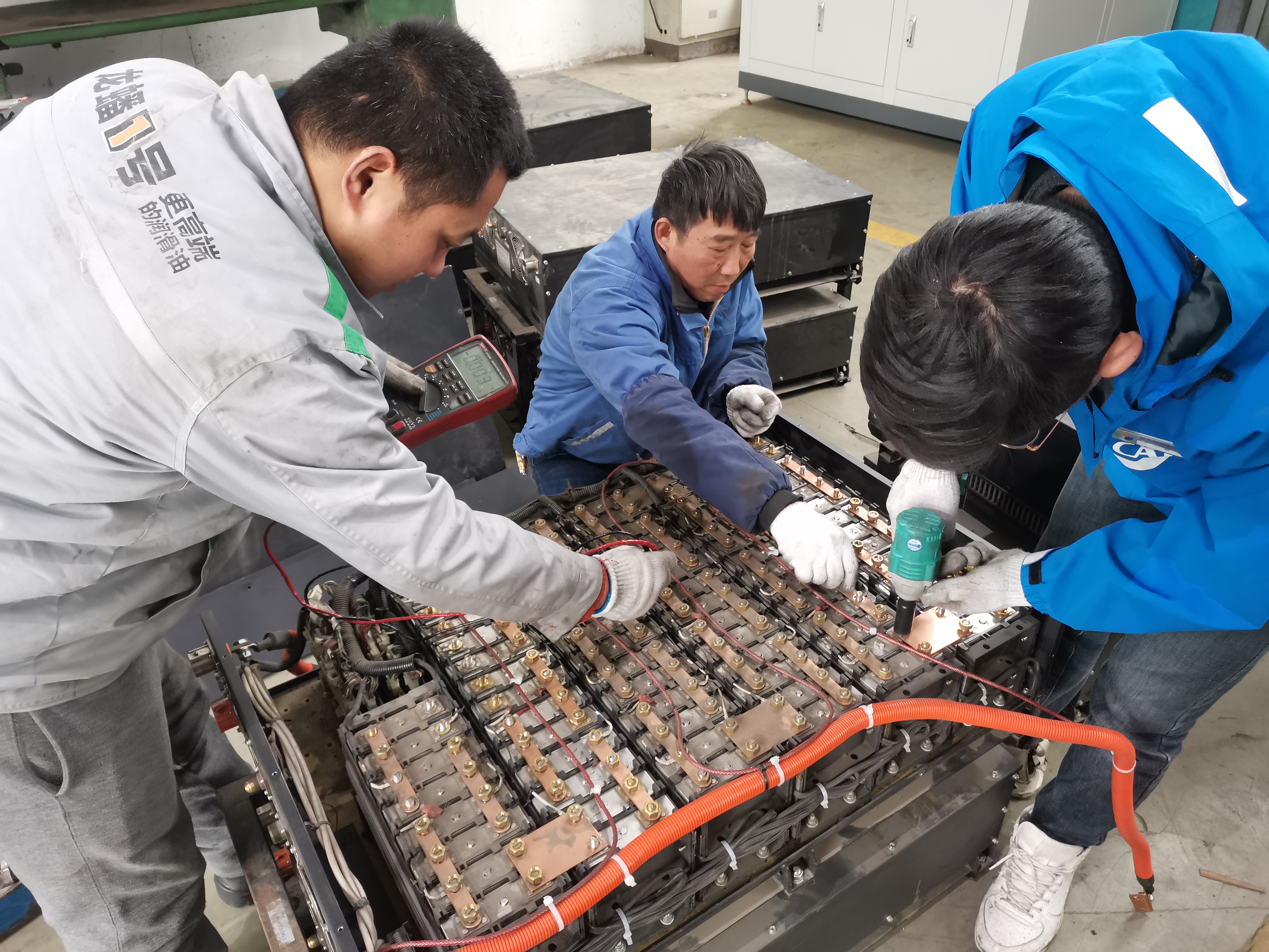 整改期間,修理廠高度重視,積極推進隊伍建設(shè),組織技術(shù)中心六名骨干人員,采用兩人一組,“老手”帶“新手”的模式,分批前往亞星裝配車間。后期,雙方為加快推進項目整改進度,亞星直接將這批動力電池發(fā)運到修理廠,修理廠以熟練的箱體拆解、單體檢測、二次篩選、補電維護等系列流程進行維護。